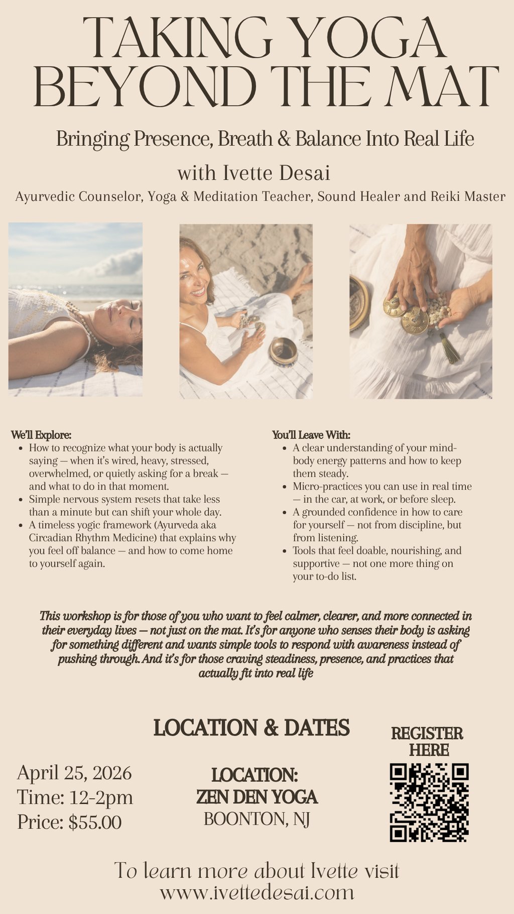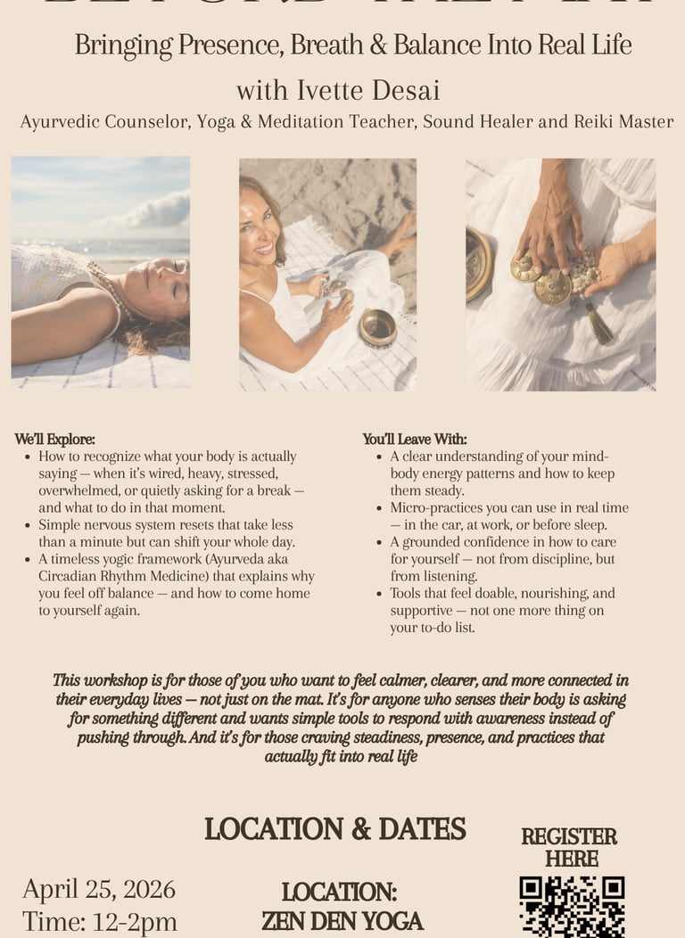 Join Ayurvedic counselor and yoga teacher Ivette Desai for a gentle, practical workshop designed to bring presence, breath, and balance into your everyday life.